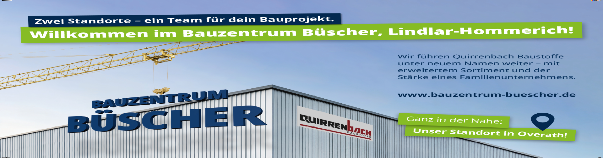 Liebe Kundinnen und Kunden,nach 100 Jahren erfolgreicher Firmengeschichte möchten wir Sie heute über eine wichtige Veränderung informieren:Zum 1. Januar 2026 wird das familiengeführte Bauzentrum Büscher aus Overath unser Unternehmen Quirrenbach Baustoffe in Lindlar-Hommerich übernehmen.Der Standort bleibt vollständig erhalten und wird künftig unter dem Namen Bauzentrum Büscher weitergeführt. Gleichzeitig profitieren Sie von der Stärke, dem erweiterten Sortiment und der langjährigen Erfahrung eines etablierten Familienunternehmens aus der Region.Was bedeutet das konkret für Sie? Bekannte Gesichter:Unser Team bleibt für Sie da – mit der gleichen Leidenschaft und Kompetenz wie bisher.Mehr Möglichkeiten:Durch den Zusammenschluss erweitern sich Sortiment und Service. Über beide Standorte hinweg stehen Ihnen künftig mehr als 10.000 Artikel zur Verfügung.Eine starke Marke:Ob in Lindlar oder Overath – künftig finden Sie an beiden Standorten das Bauzentrum Büscher mit dem gleichen Versprechen: Qualität, Service und Beratung auf höchstem Niveau.Ein Schritt mit Herz und VerantwortungNach vielen Jahrzehnten im Familienbesitz war es uns wichtig, unser Lebenswerk in gute Hände zu über-geben. Mit Bauzentrum Büscher haben wir einen Partner gefunden, der unsere Werte teilt und die Zukunft des Standorts langfristig sichert – für unsere Kundinnen und Kunden, für unsere Mitarbeiterinnen und Mitarbeiter und für die Region.